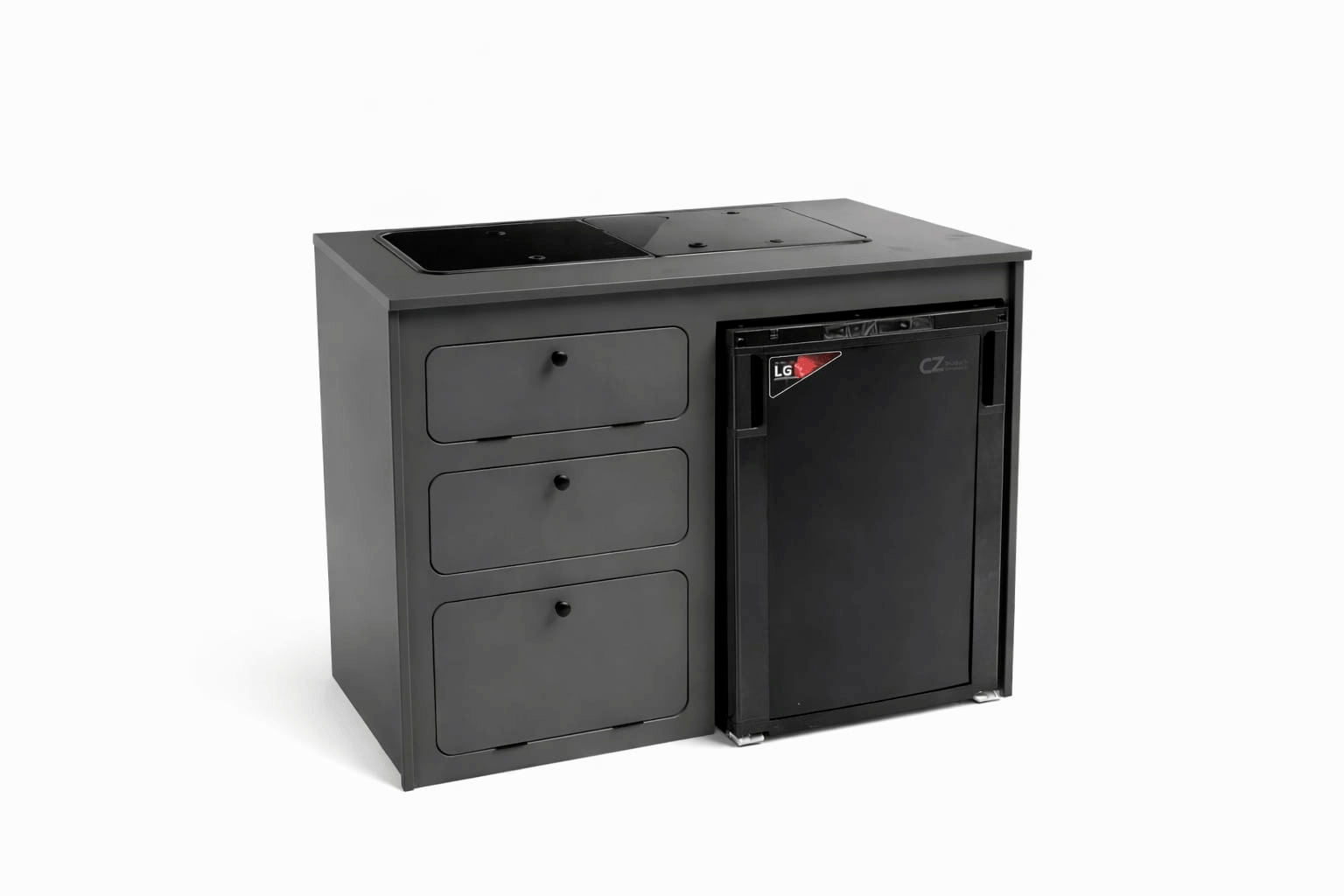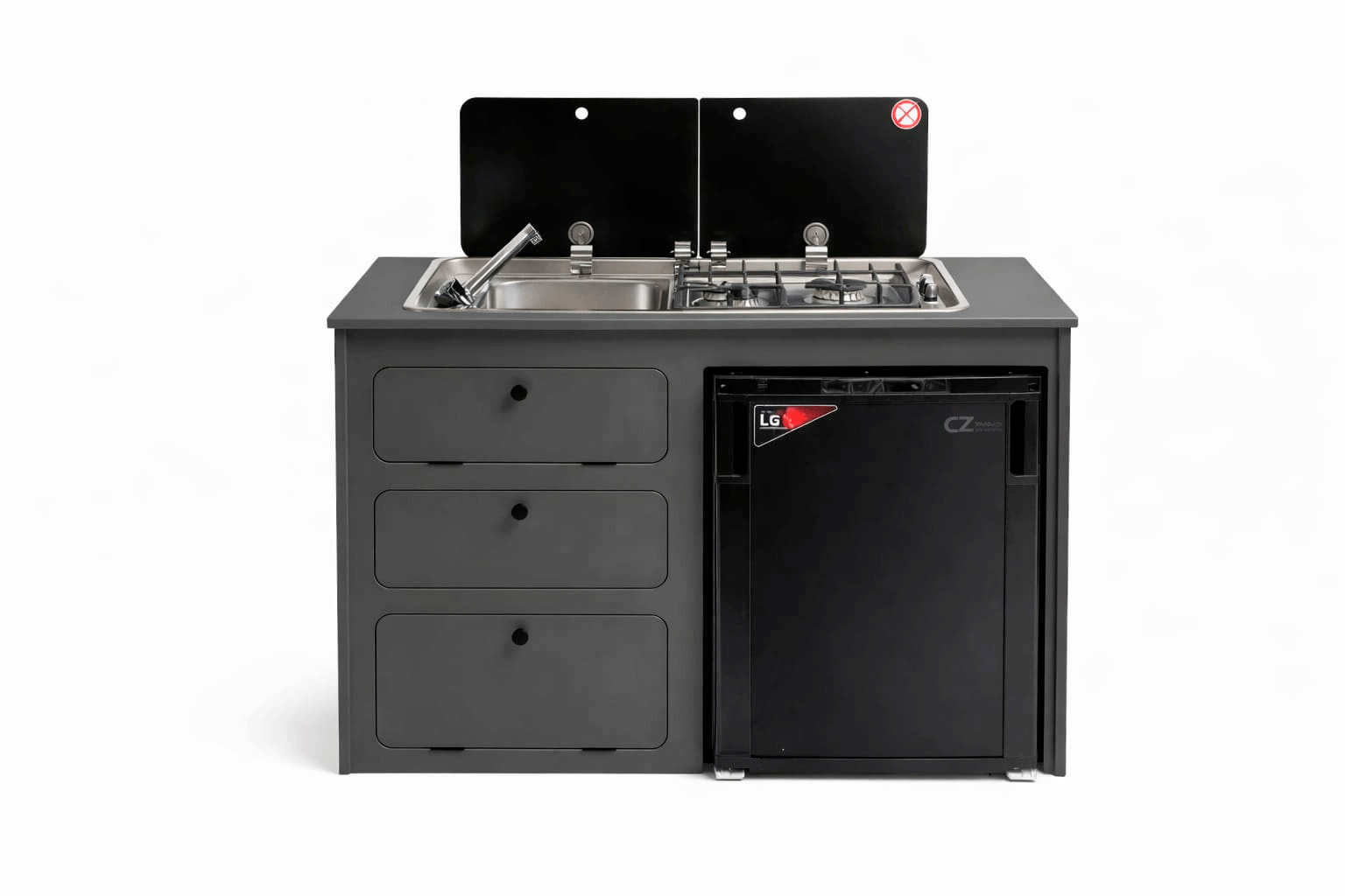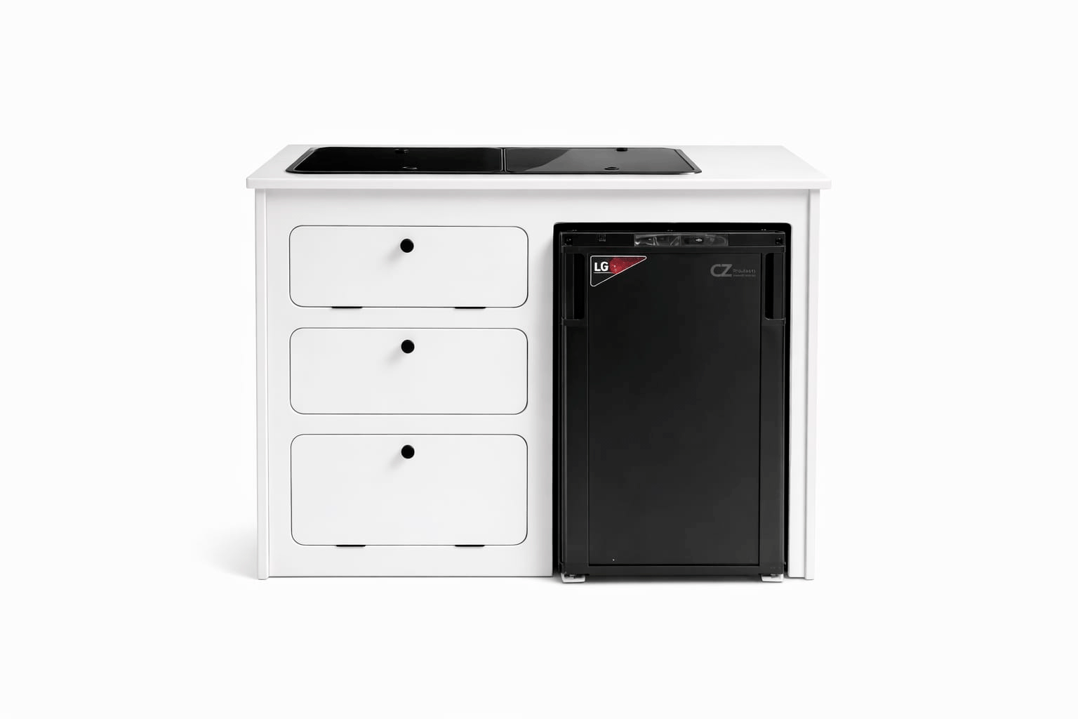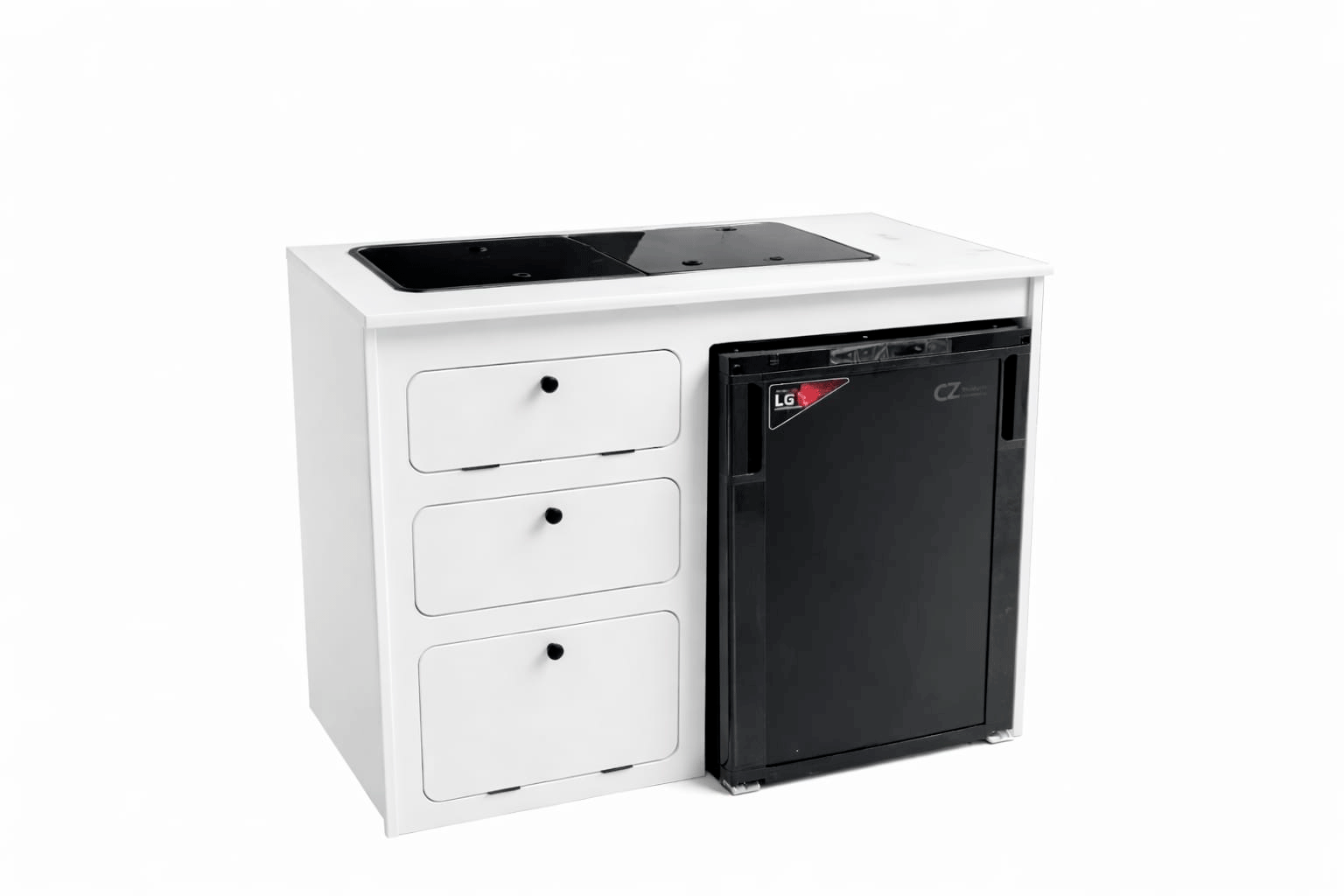 Mueble cocina camper con hueco para nevera CZ 85L, cajón extraíble y compartimento para bombona de gas. Ideal para proyectos de camperización.